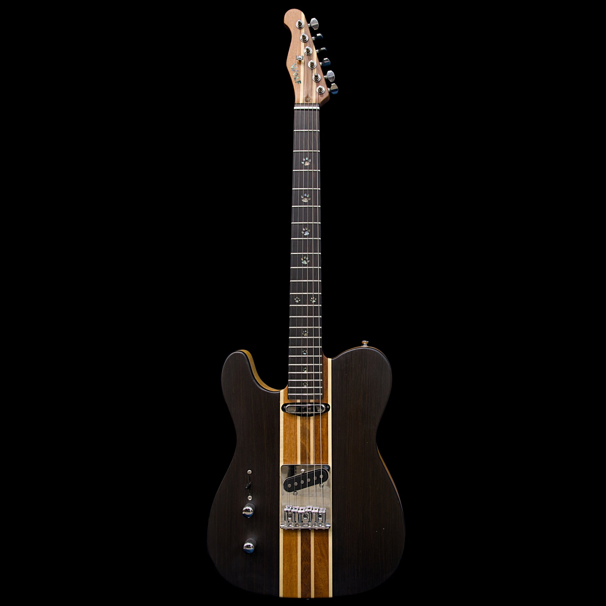 The body is built from resonant Asian Nato heartwood with a thick rosewood cap. The T-Dawg is loaded with chrome hardware, Custom wound wolf breath single coil pickups, 3-way switch, volume and tone controls in a smooth matte finish. The highly stable five piece Nato and Maple neck comes with 22 medium frets on an ebony fingerboard with custom abalone wolf paw inlays.